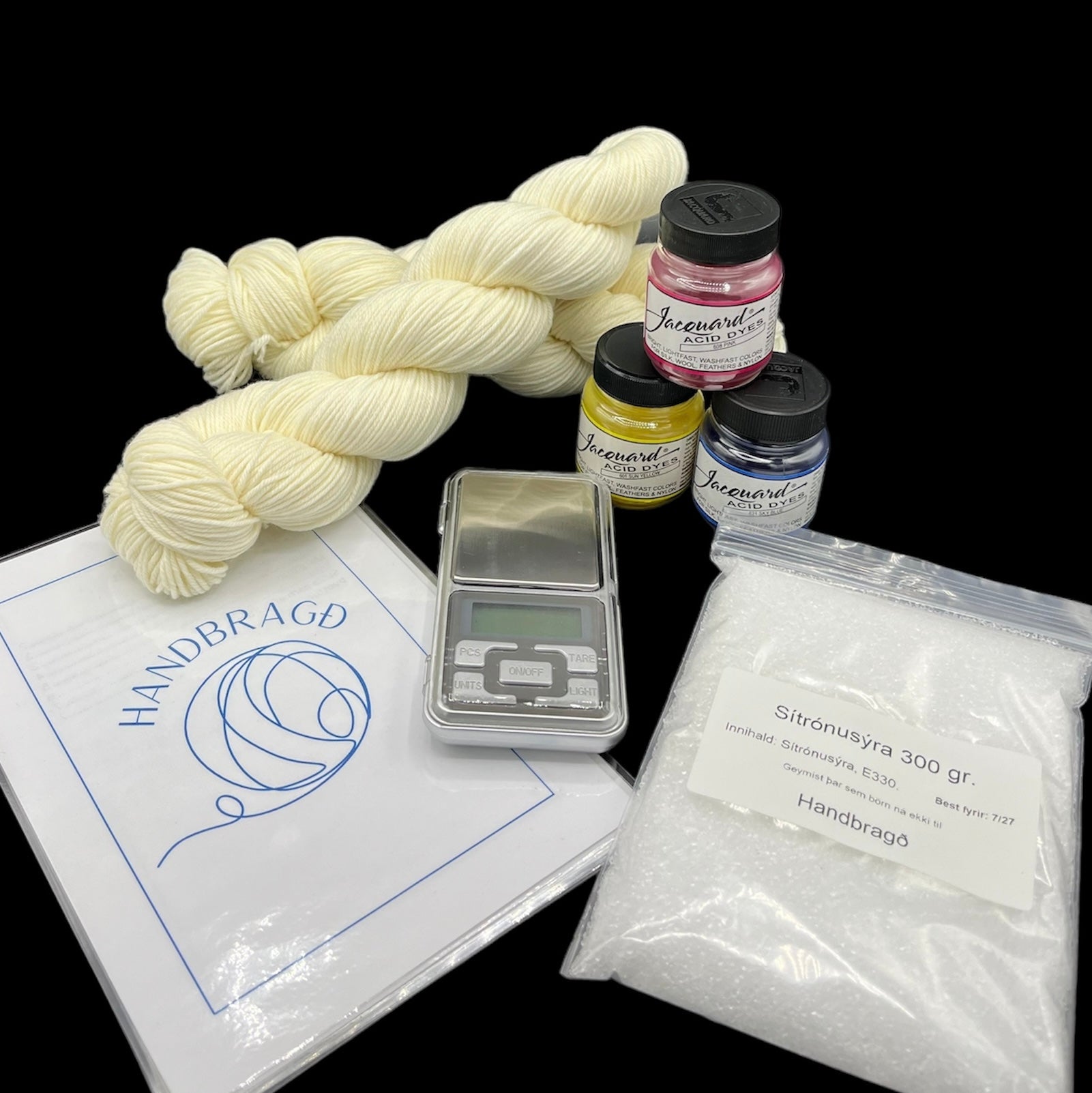 Einnig fylgir 300g. sítrónusýru, nákvæm vigt 2x 200 ml flöskur með mjóum stút. og leiðbeiningar svo þú getir byrjað að lita þitt eigið garn!